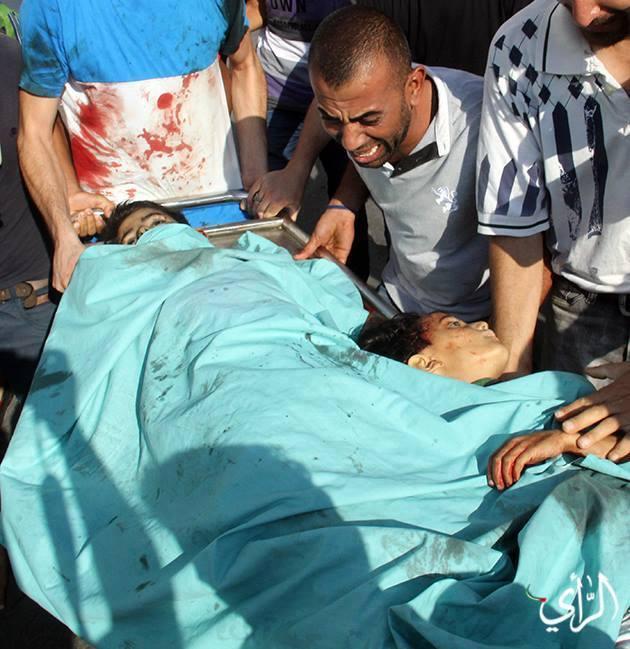 (Palestinian men carry the body of a young boy, who was killed by Israeli shelling on a beach in Gaza City)